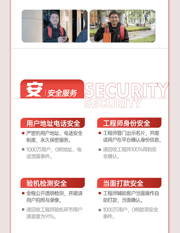安全服务。在安全上,“地址电话安全”、“工程师身份安全”、“信息清除安全”、“款项安全”更是设定8大环节,让社会乱象、客户隐忧一一排除。其中信息安全是和支付宝、蚂蚁链共同合作,获得全链路服务与保障。服务到达极致,安全满意度自然100%。