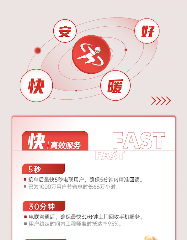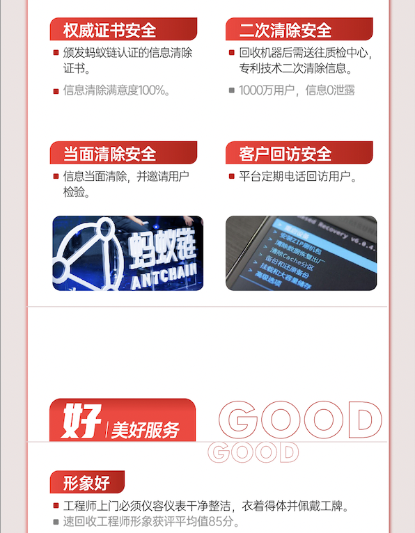 高效服务。在时间上,为客户节省大量成本。“5秒接单”服务,已为1000万用户节省总时长66万小时。“30分钟上门回收”,让客户足不出户享受服务。“5秒到账”、“最快15分钟客诉处理”、“最快48小时发送信息清除证书”无不针对客户痛点,解决客户后顾之忧。其中专业高效服务最快可在10分钟内完成,比门店回收至少为客户节省1.5小时。