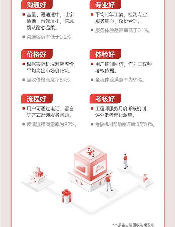 2022年末,速回收总结7年来“工程师上门回收”的服务经验,以“30分钟工程师上门”为核心,优化4大类48项细节执行服务流程,最终为全行业提供一套足以通行的“手机上门回收服务标准”,力求以专业标准服务水平,提高全民循环积极性。