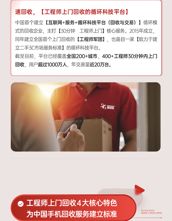 速回收,是国内领先的专业手机数码回收、质检、交易平台,也是中国首个建立【互联网+服务+循环科技平台(回收与交易)】循环模式的回收企业。速回收旗下业务包括手机回收(支付宝小程序、微信小程序、app等回收入口)、手机租赁交易(万租网、抖音小店)、手机行业咨询(爱机回收公众号)、信息安全管理(通过支付宝蚂蚁链技术彻底清除隐私信息后颁发安全证书)等全链条服务板块。截至目前,平台已经覆盖全国200+城市,400+工程师30分钟内上门回收,用户超过1000万人,年交易量近20万台。