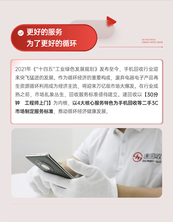 与此同时,经数据显示,我国仍存在手机社会闲置量高达60亿部(十四五期间)现象。是什么影响手机回收?为何大众宁愿将手机闲置也不愿回收手机?速回收通过与支付宝合作多年获得的行业数据经研判得到这一答案为“服务”后,制定出供全行业参照的《白皮书》,以改进服务标准,改善大众客户体验,从而改变手机闲置的社会状况,推动循环经济更好更快的发展。