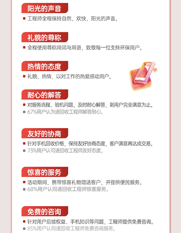 美好服务。在全程服务过程中,“工程师形象”、“10年工龄的专业服务”、“价格”、“反馈流程与考核”等达成“让手机回收变成美好事件”的基本条件。