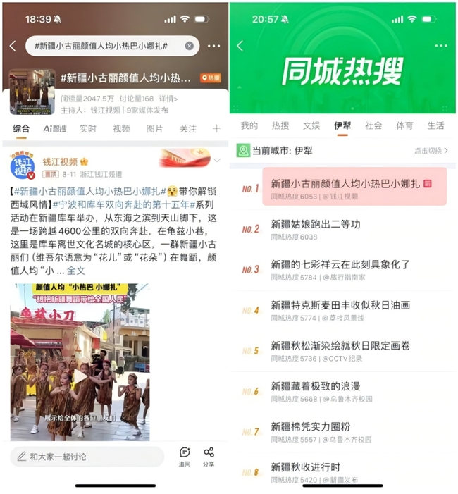 #这个暑假新疆库车有多火#、#新疆小古丽颜值人均小热巴小娜扎#登上全疆热搜第一位,阅读量合计超5100万。