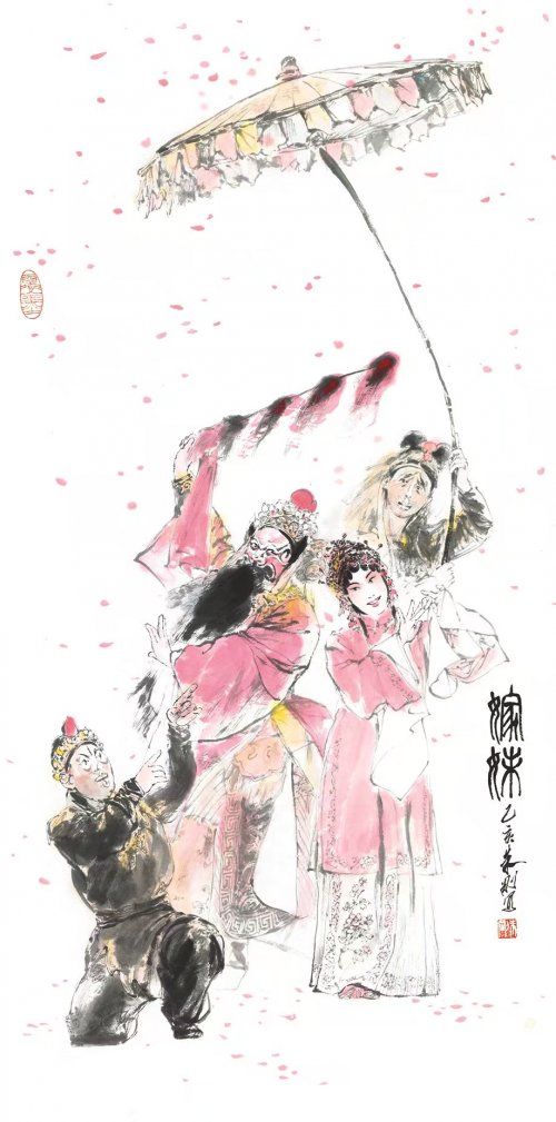 戏曲舞台上的一颦一笑被笔墨定格,宣纸上的线条仿佛还带着戏台上的温度,朱刚的画笔下,传统戏曲人物焕发出新的生命力。