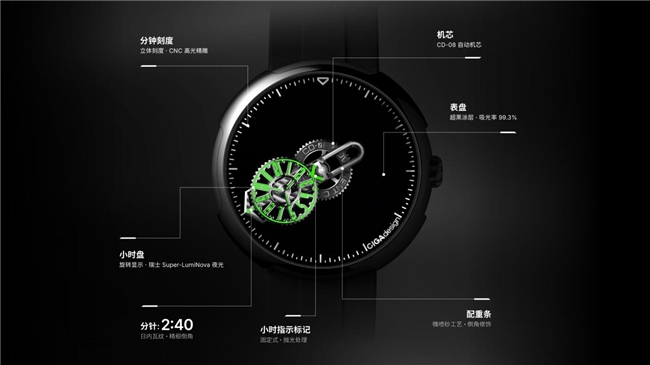 腕表突破性采用日本“黑色无双”超黑丙烯酸涂料,可吸收99.4%的入射光线,让表盘化作深邃虚空,漫游的机械结构仿若悬浮其中,视觉质感拉满;搭配CNC精雕高光立体分钟刻度,与超黑基底形成精准视觉反差,辅以日内瓦纹、局部镂空、拉丝、抛光及瑞士Super-LumiNova夜光涂层等多重精密工艺,每一处细节都尽显匠心。