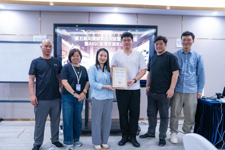 实训班特别在结营环节增设学员互评机制,各小组依次展示作品、分享创作心得,全体学员从创意构思、技术实现、叙事节奏、画面质感等维度进行打分与交流。这种开放互动的评价方式,让创作者在互相学习中发现亮点、正视不足,进一步拓宽创作思路。现场还举行AIGC金漫奖颁奖仪式,为优秀作品与优秀创作者颁发荣誉,肯定大家五日以来的努力与成长。
