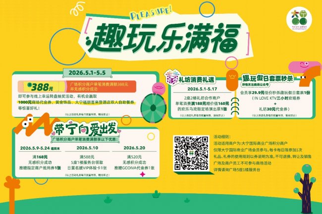 5月1日-5月5日,广场积分商户单笔消费满额388元并无感积分成功,即可参与线上幸运转盘抽奖活动,有机会赢取1000元商场代金券、黄金饰品、喜来登双人自助晚餐券等惊喜好礼!5月1日-5月17日,2座2楼礼坊合作商户单笔消费满188元赠价值160元的欢乐马戏指定场演出票1张;还有超值秒杀,大宁国际会员享29.9元低价秒杀趣玩假日套票1份,详情关注商场公众号。5月,大宁国际新注册会员首次任意消费或老会员消费满168元即可获得一次抽奖机会,消耗9积分可额外增加抽奖机会,有机会赢取丰富好礼。(以上活动礼券均数量有限,赠完/售完即止)。